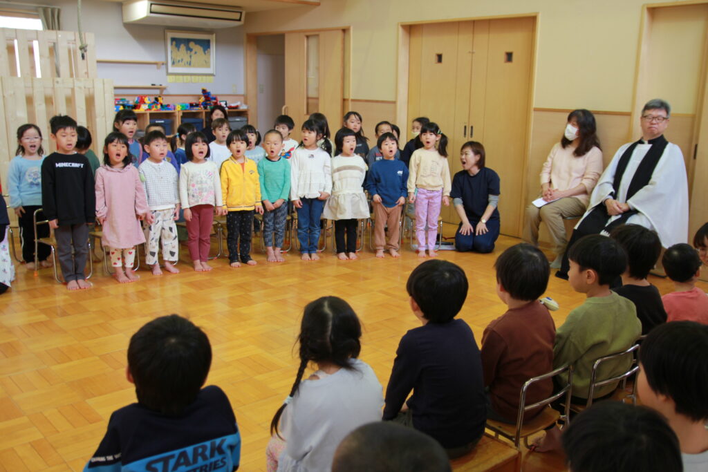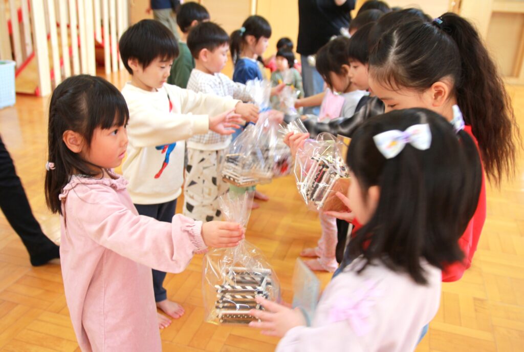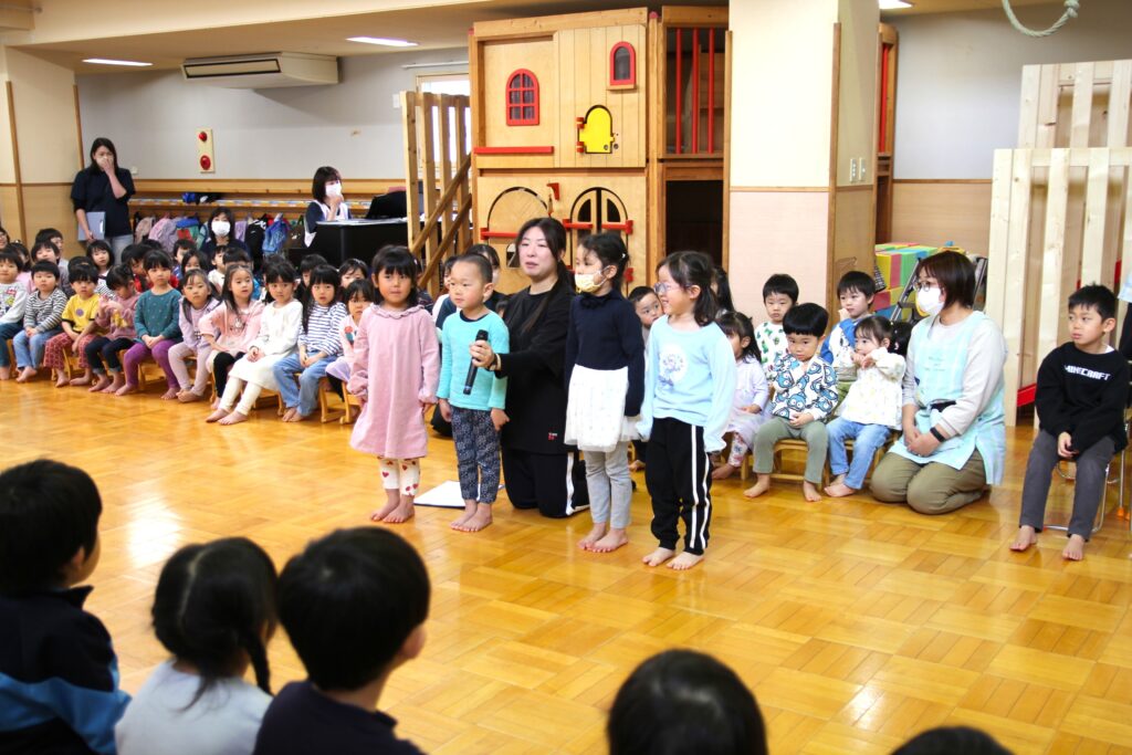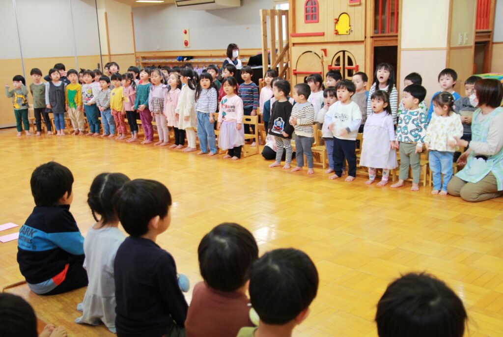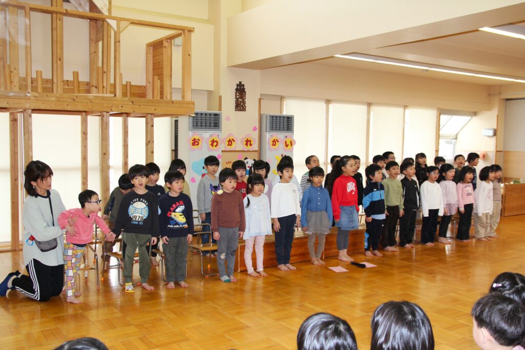 3月6日(金)、3月で卒園する「エルマーとりゅう(年長)」組のお祝いと、退職する先生方への感謝の気持ちを込めてお別れ会を行いました。各クラスからはプレゼントの歌を披露。「ちぃくま・しろくまこぐま(満2・3)」組と「ぐりとぐら(年少)」組が、一緒に『たいせつなたからもの』を、「こんとあき(年中)」組は、『てびょうしいっぱいおめでとう』を身振りを加えながら素敵な声で歌ってくれました。先生たちも子どもたちに負けじと、寸劇『色々がらがらどん』を発表。ホールを笑いでいっぱいにしていました。続いて、お二人の退職する先生たちからご挨拶があり、お世話になったクラスの子どもたちから花束が贈られました。そして、年長さんからのお礼の歌『またね☆』『ありがとう』ではすばらしい歌声を聴かせてくれました。最後は全員で心を合わせて『ビリーブ』を歌い、会が終了しました。お昼は、縦割りのグループに分かれてオードブルを楽しみ、最後は一人一人に手づくりのプレゼントを渡しました。