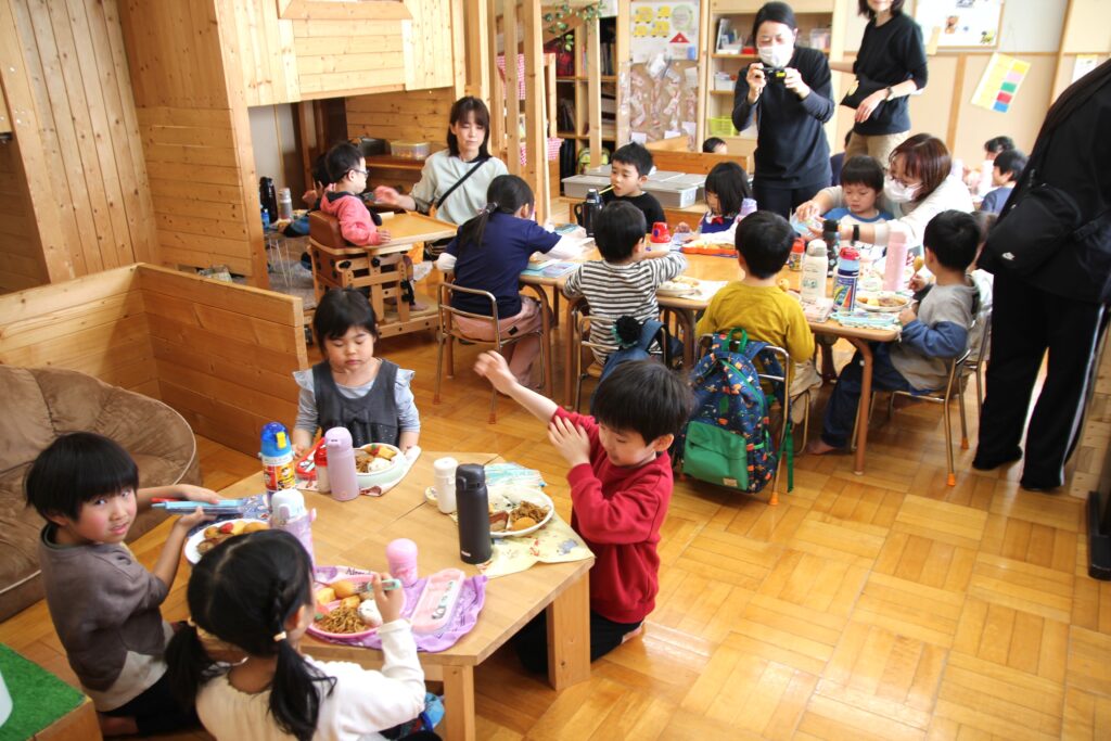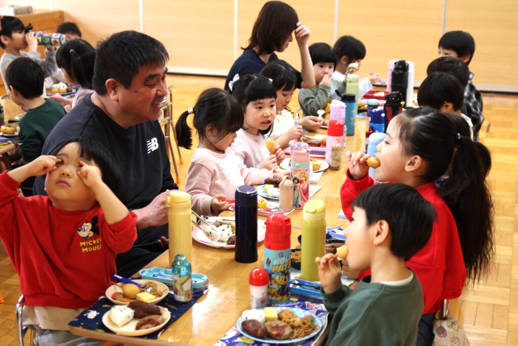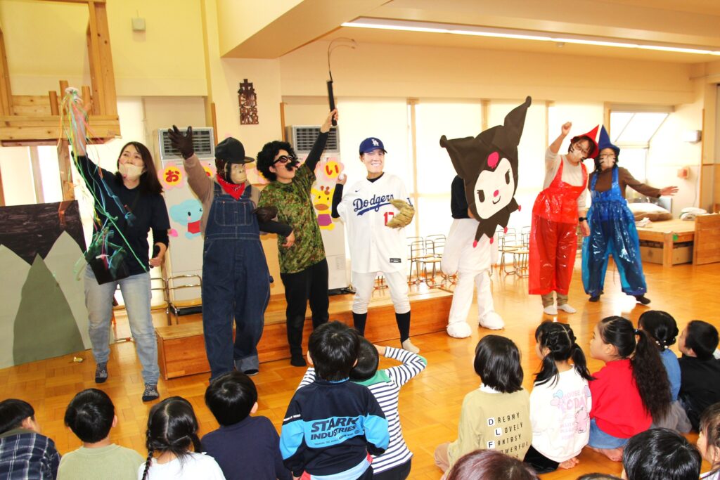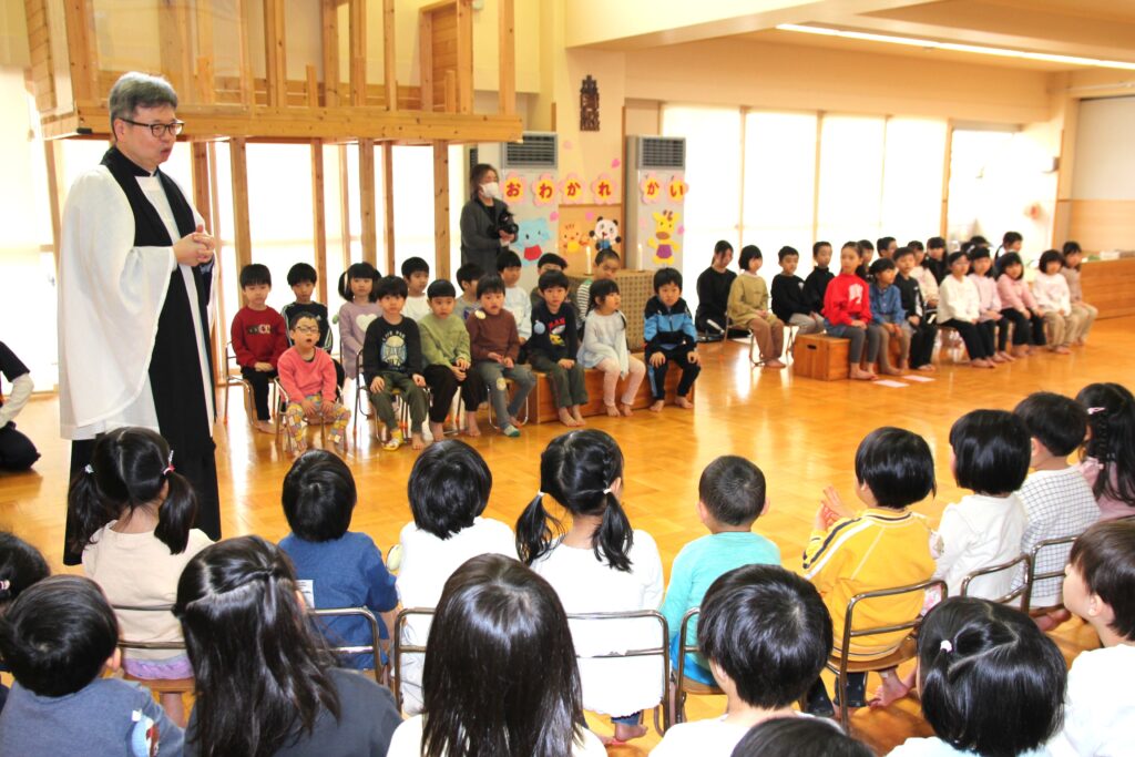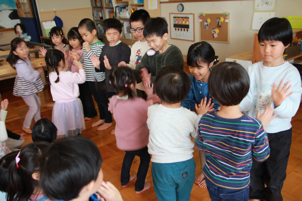 3月6日(金)、3月で卒園する「エルマーとりゅう(年長)」組のお祝いと、退職する先生方への感謝の気持ちを込めてお別れ会を行いました。各クラスからはプレゼントの歌を披露。「ちぃくま・しろくまこぐま(満2・3)」組と「ぐりとぐら(年少)」組が、一緒に『たいせつなたからもの』を、「こんとあき(年中)」組は、『てびょうしいっぱいおめでとう』を身振りを加えながら素敵な声で歌ってくれました。先生たちも子どもたちに負けじと、寸劇『色々がらがらどん』を発表。ホールを笑いでいっぱいにしていました。続いて、お二人の退職する先生たちからご挨拶があり、お世話になったクラスの子どもたちから花束が贈られました。そして、年長さんからのお礼の歌『またね☆』『ありがとう』ではすばらしい歌声を聴かせてくれました。最後は全員で心を合わせて『ビリーブ』を歌い、会が終了しました。お昼は、縦割りのグループに分かれてオードブルを楽しみ、最後は一人一人に手づくりのプレゼントを渡しました。