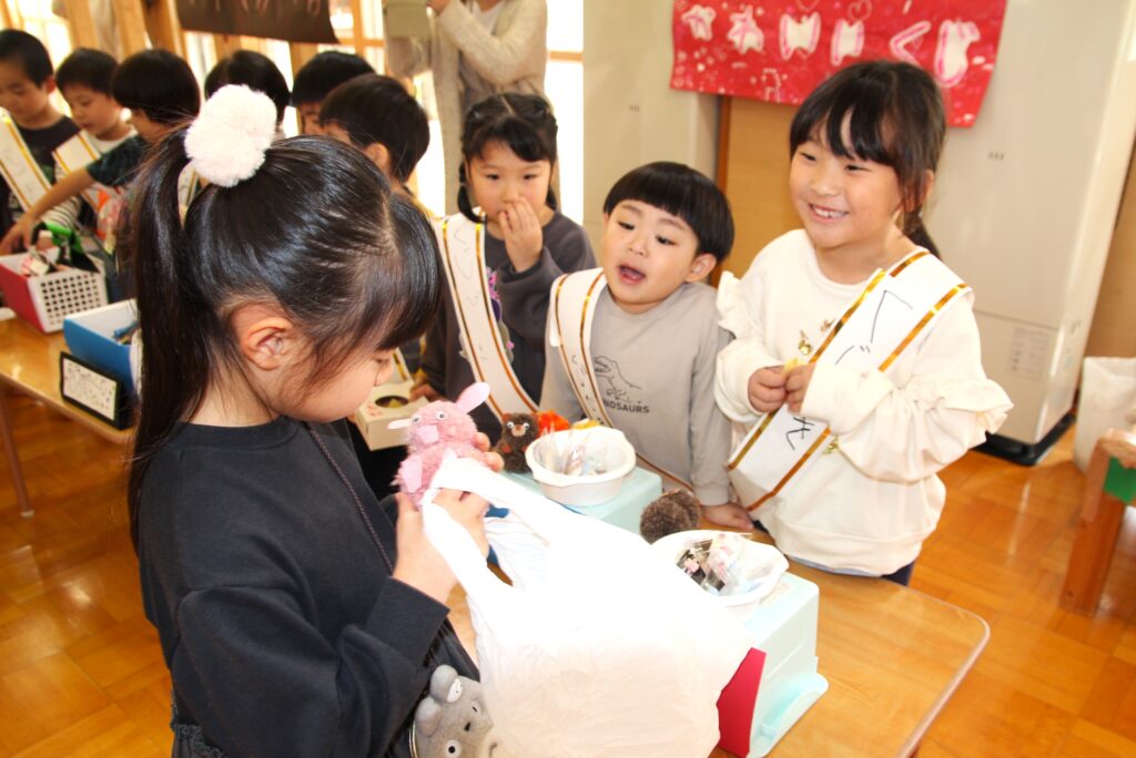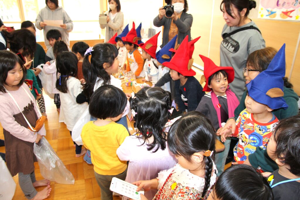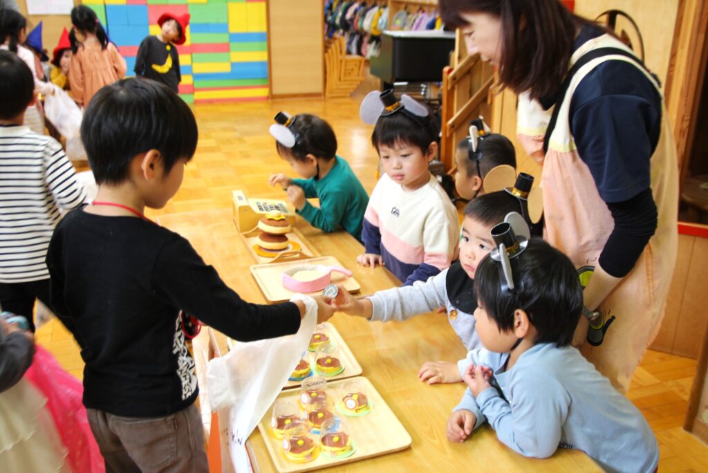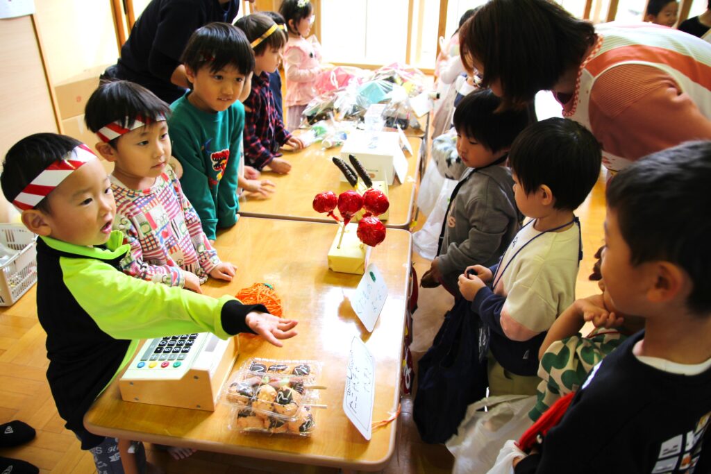 10月21日(火)、この時期恒例の「お買い物ごっこ」を行いました。何屋さんをしたいのかクラスごとに話し合い、コツコツと品物を作りためてきました。「ちいくま、しろくま・こぐま(満2・3)」組は、ほっとけーきやさん。「ぐりとぐら(年少)」組は、すぺしゃるしょっぷ。「こんとあき(年中)」組は、おまつりやさんとへんしんやさん。「エルマーとりゅう(年長)」組は、ようかいくじとかわいいくじ。年長さんに近づくにつれ、品物をほぼ自分たちの力で作り上げるようになります。本番では、自分でほしいものを選んだり、お客さんとお店屋さんに別れてやりとりしたり、楽しい中でいろいろな経験をします。自分たちで作った作品が完売した時の喜びはまた格別です。どのクラスからも完売の「ばんざい!」が聞こえてきました。