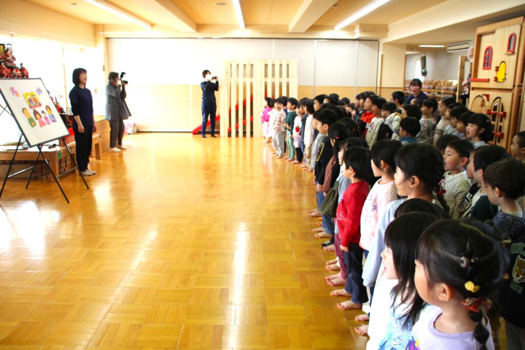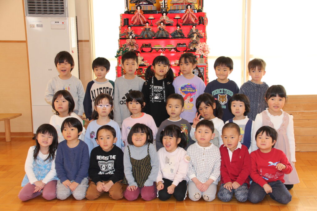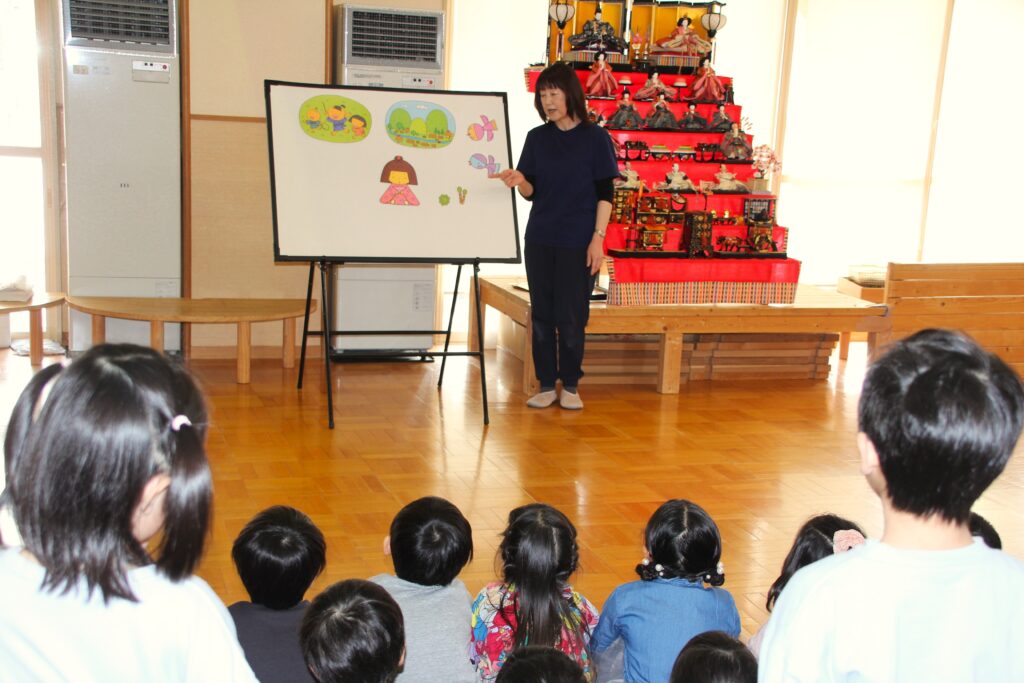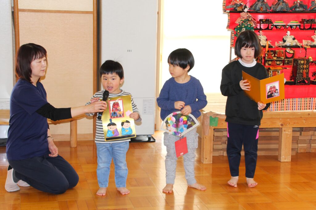 桃の節句の3月3日(火)、聖十字幼稚園でもひな壇をホールに飾り「ひなまつり」のお祝いをしました。はじめに、各クラスの代表から、ひなまつりに合わせて制作した作品について発表を行いました。そして、パネルシアターで先生からひなまつりの由来についてお話を聞きました。最後は、みんなで「うれしいひなまつり」を元気に歌いました。お部屋に戻り、お昼にはひなあられを食べました。