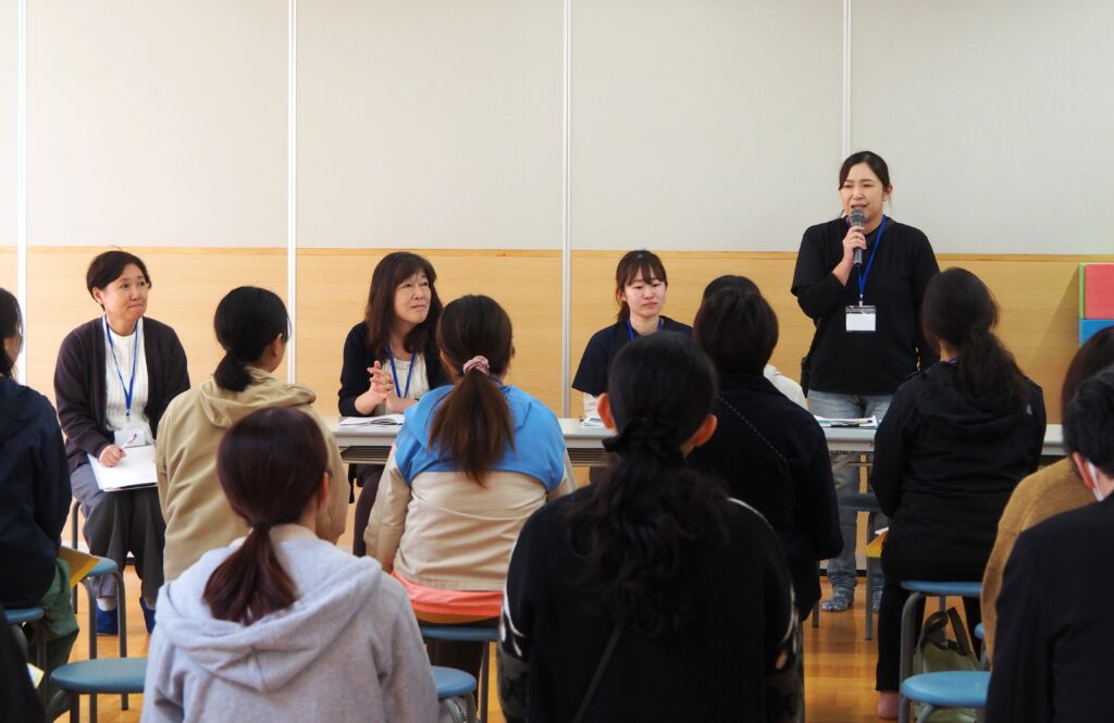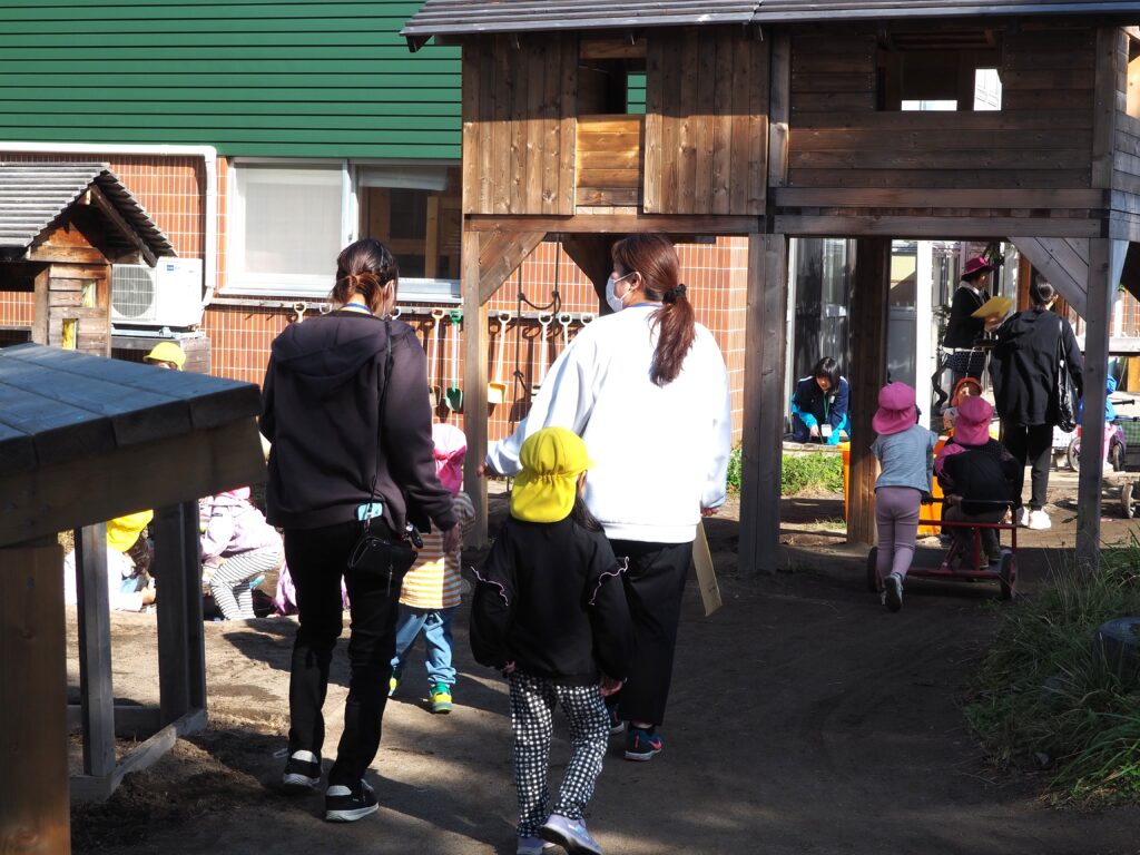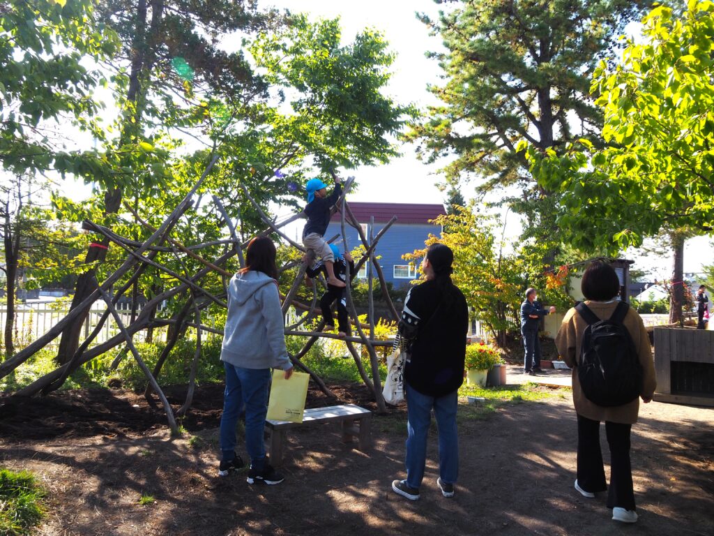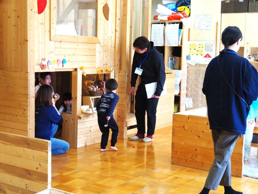 10月15日(水)、「遊ぶ・学ぶ」をテーマに、聖十字幼稚園では初めてとなる独自の公開保育を開催しました。現在の園庭や各部屋の手づくり遊具は、開園50周年を節目に先生たちと保護者が、保育環境の専門家と一級建築士の指導を得ながら築き上げてきたものです。このたび、これらの環境や、幼稚園のめざす教育・保育について、教育関係者や岩見沢市内の幼稚園・保育園の先生方にご覧いただき、ご意見をいただくことで学びを深めたいと考えました。年長児の保護者を含め、50名近くのご参加をいただきましたが、自由遊び、クラス活動後の交流会では、幼児期における遊びの重要性を共有することができ、大変有意義な時間となりました。