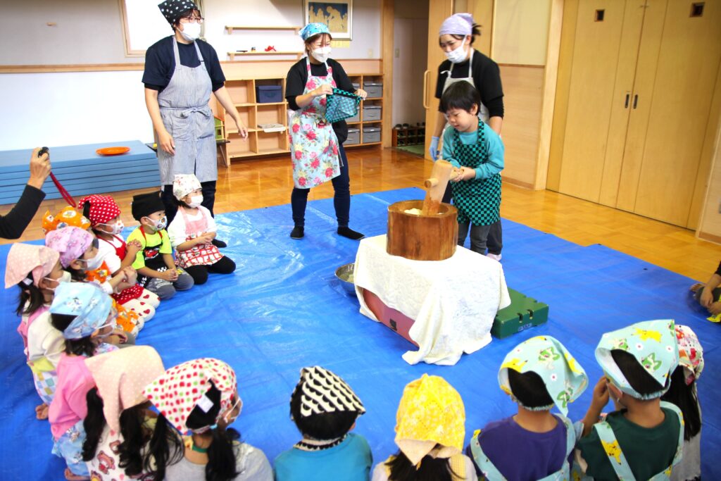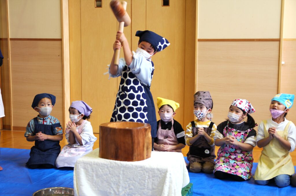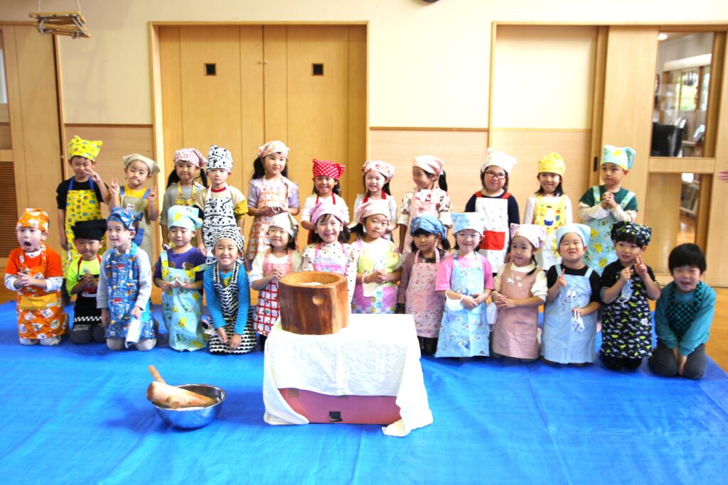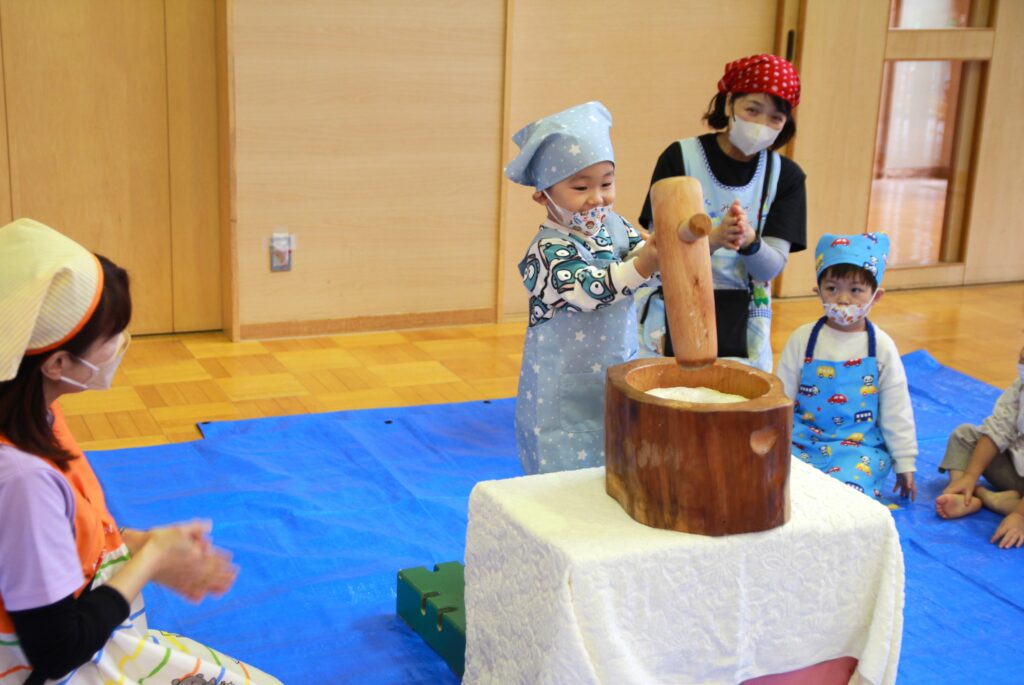 11月7日(金)、神様が与えてくださった秋の実りに感謝することを目的とした「収穫感謝祭」を行いました。これまでも園庭や農園で育ったぶどうやえだまめ、さつまいもやじゃがいもなど、秋の味覚を楽しんできましたが、この日はもちつきに挑戦です。クラスごと順番におもちをつき、お父さんお母さんたちに取り分けていただいたおもちを丸めました。お部屋に戻ってからは、お昼ご飯の最後にきなこもちとみたらしもちをデザートとして食べました。どのクラスでもおかわりの長い行列ができていました。お忙しい中お手伝いにかけつけてくださいました保護者の皆様、大変ありがとうございました。