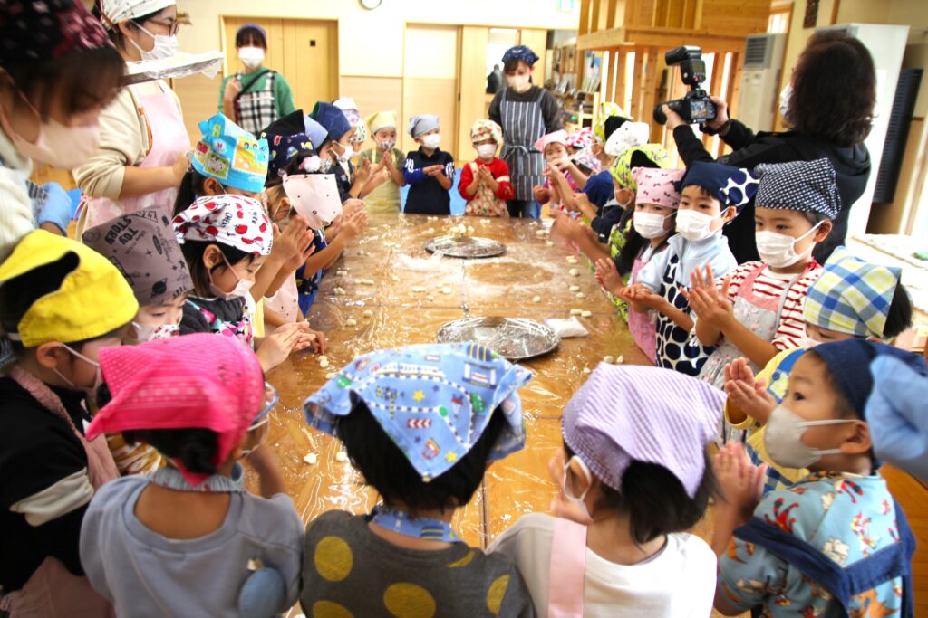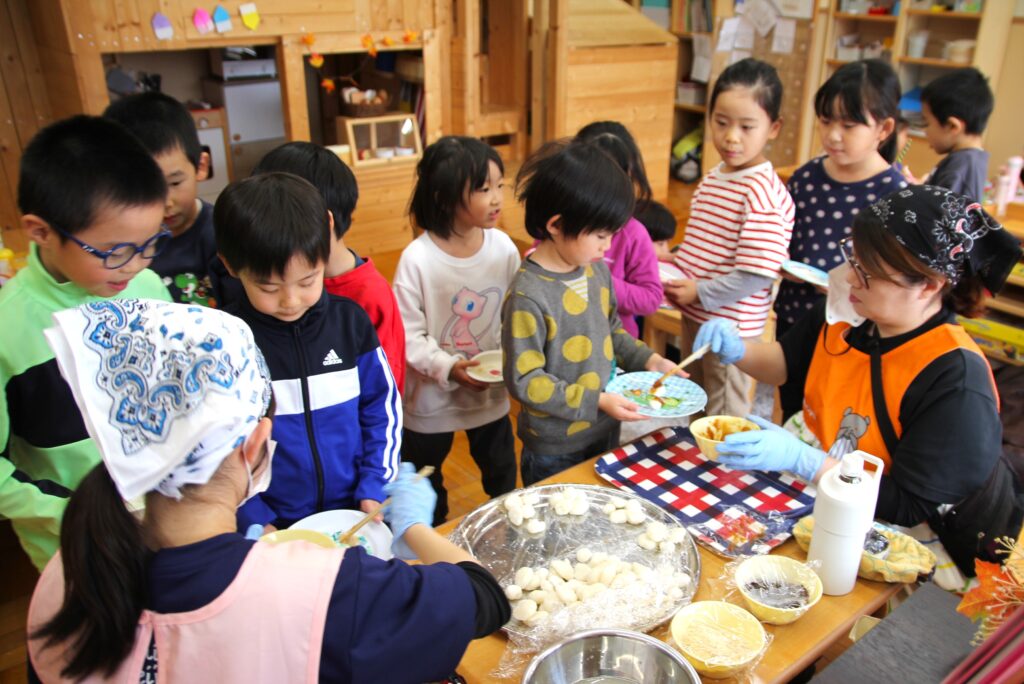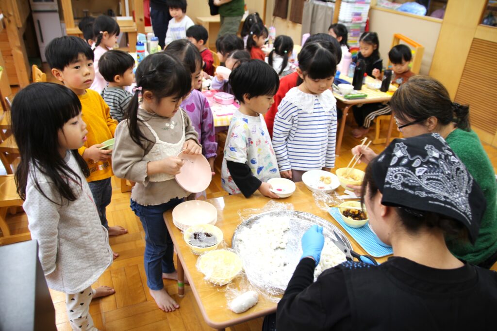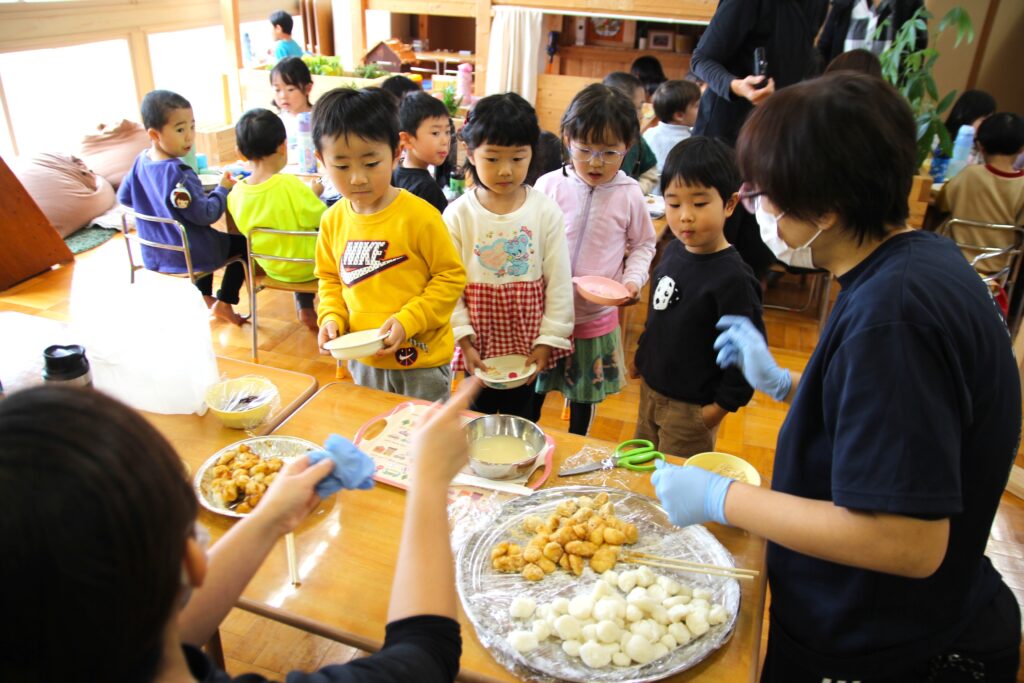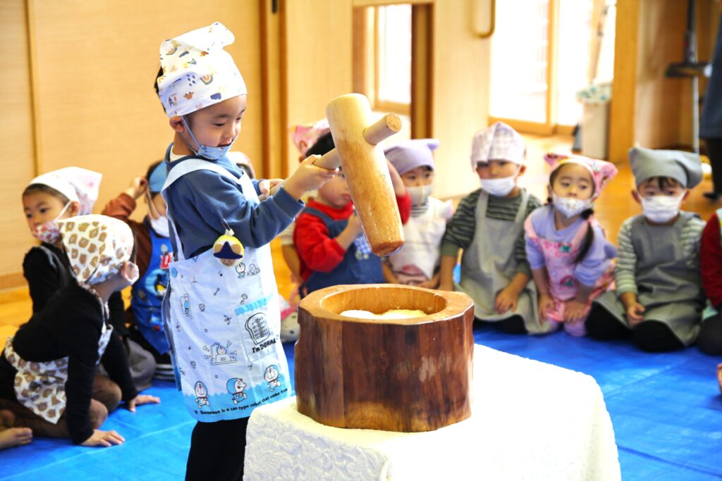 11月7日(金)、神様が与えてくださった秋の実りに感謝することを目的とした「収穫感謝祭」を行いました。これまでも園庭や農園で育ったぶどうやえだまめ、さつまいもやじゃがいもなど、秋の味覚を楽しんできましたが、この日はもちつきに挑戦です。クラスごと順番におもちをつき、お父さんお母さんたちに取り分けていただいたおもちを丸めました。お部屋に戻ってからは、お昼ご飯の最後にきなこもちとみたらしもちをデザートとして食べました。どのクラスでもおかわりの長い行列ができていました。お忙しい中お手伝いにかけつけてくださいました保護者の皆様、大変ありがとうございました。