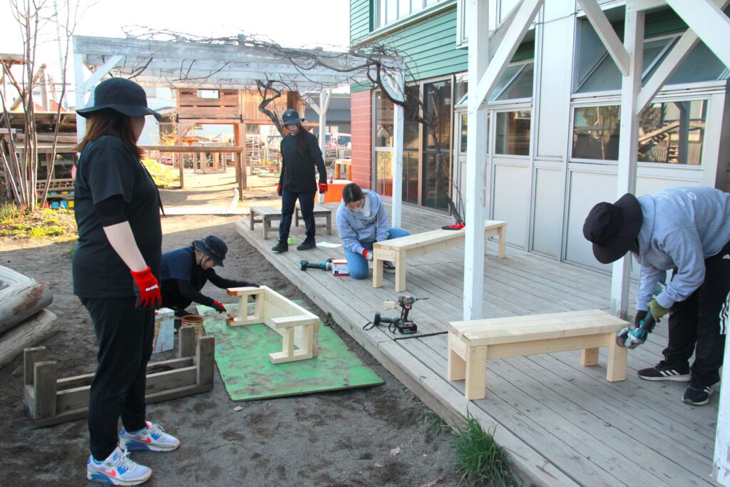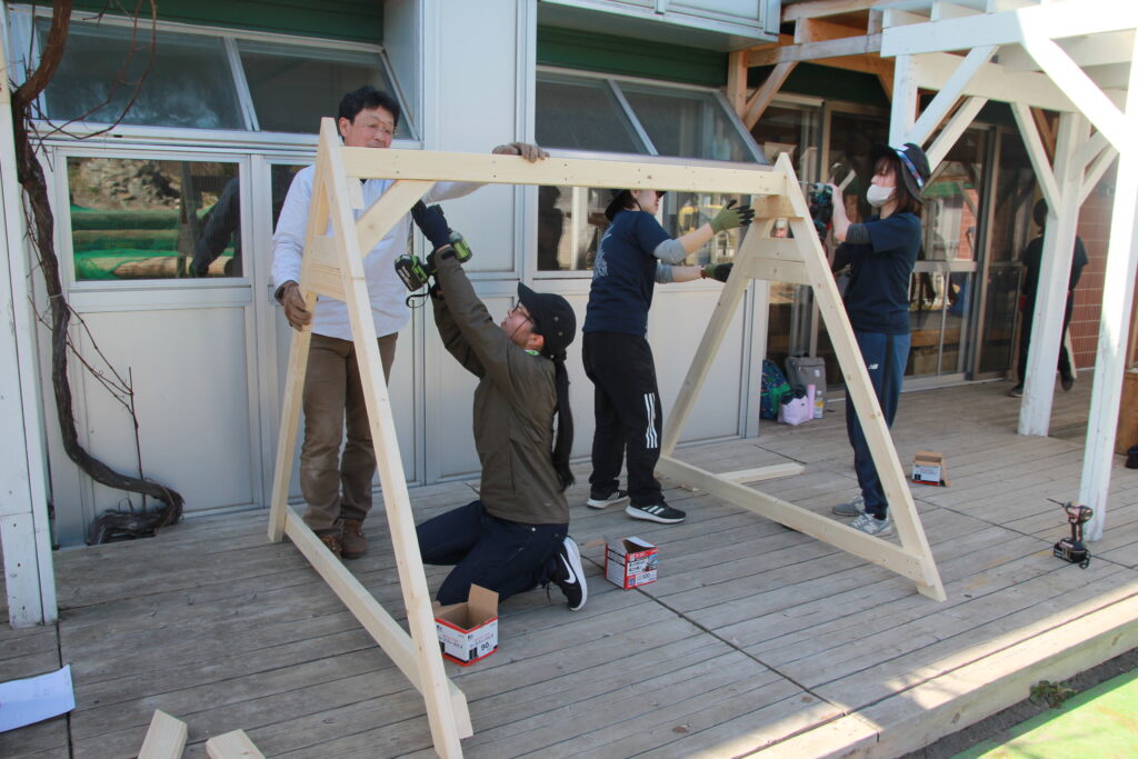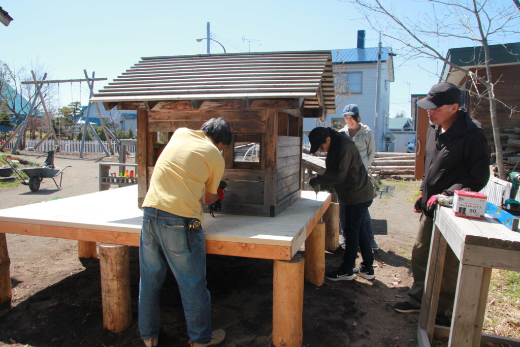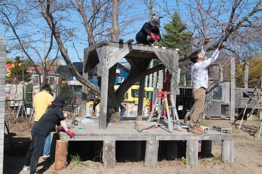 4月15日(水)と16日(木)の2日間、春の園庭作業を実施しました。この時期の作業は、冬の間雪で覆われていた遊具のメンテナンスを行い、子どもたちが安全に遊べるようにすることが主な目的です。今回も一級建築士 井上 寿先生と大空教育研究所長 木村歩美先生にご指導をいただき、また保護者のご参加もいただきながら作業を進めました。天気にも恵まれ、土台となる丸太の入れ替えや床の張替え、ブランコの増設など、園庭がリフレッシュしました。
