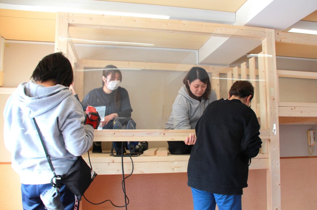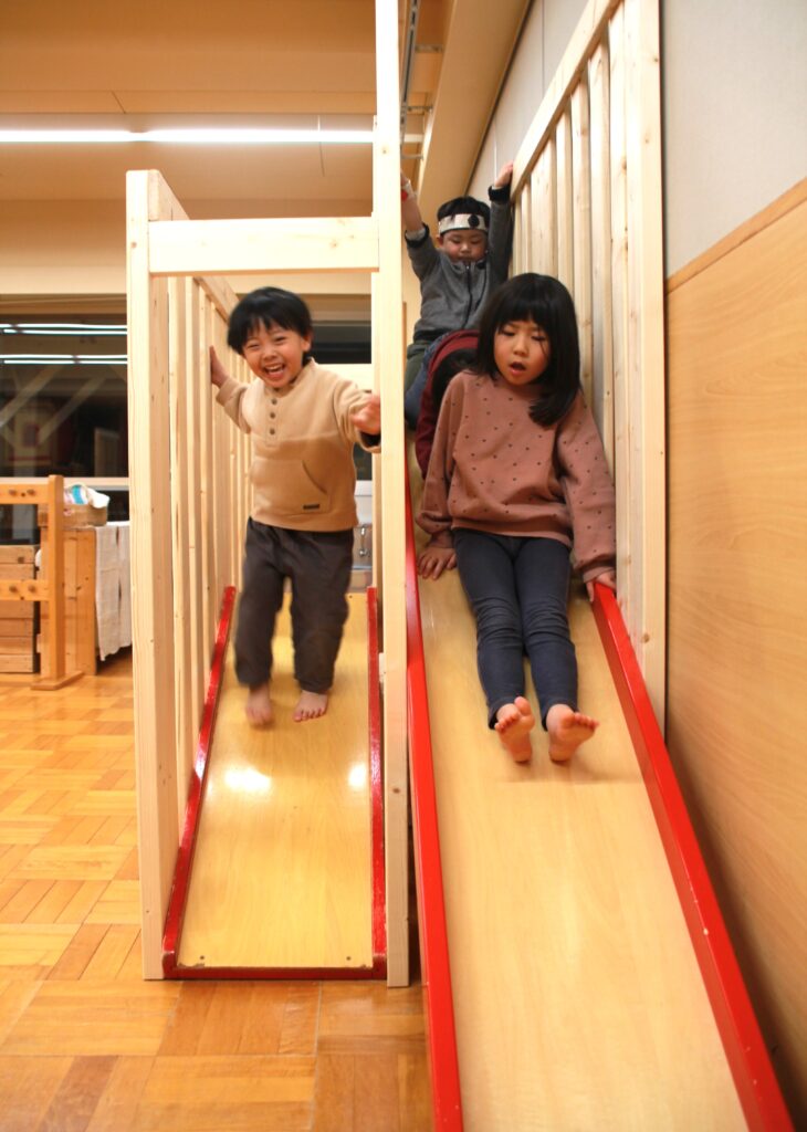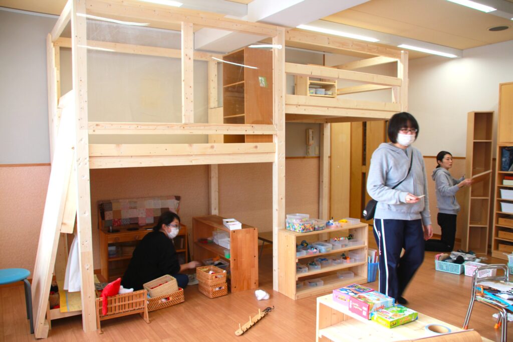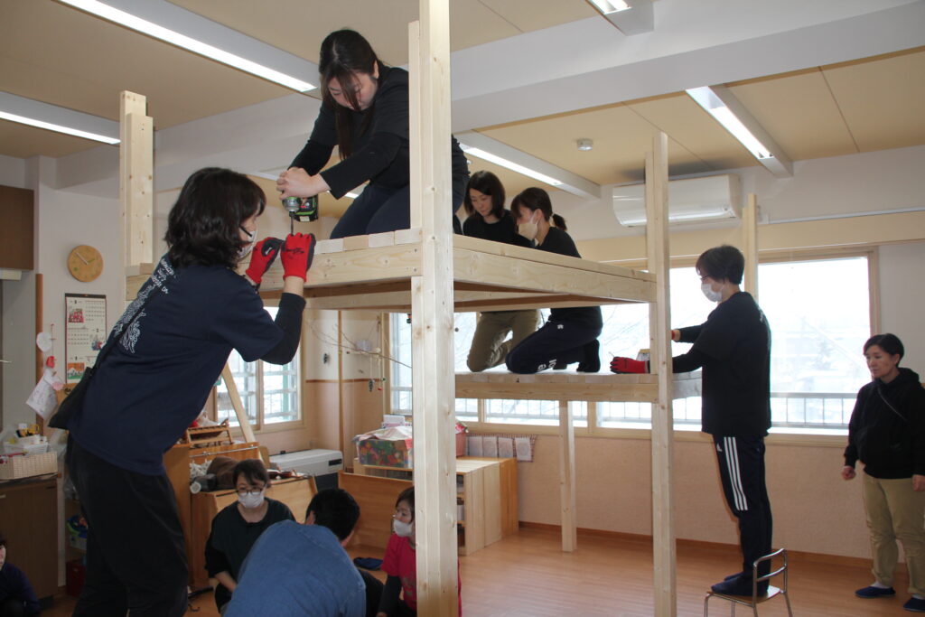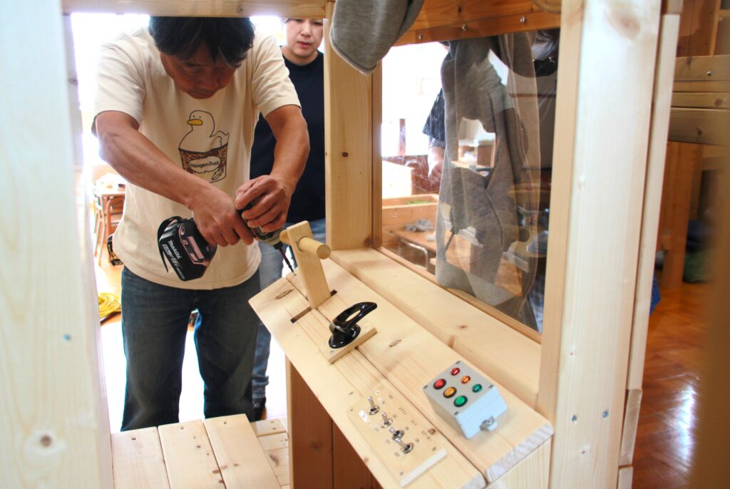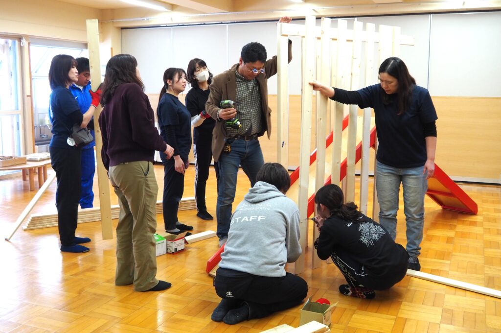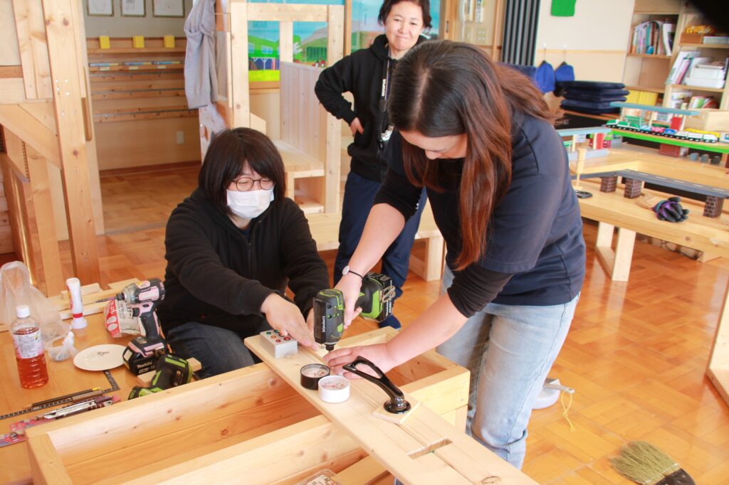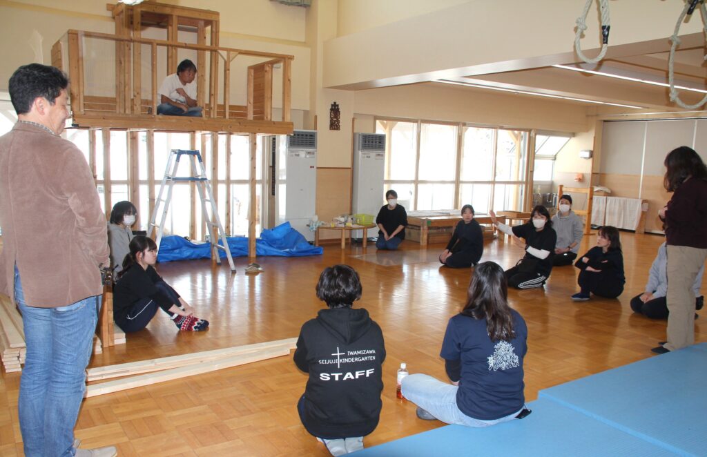 1月8日(木)と9日(金)の2日間、おおぞら教育研究所長の木村歩美氏、一級建築士の井上寿氏に講師をお願いし、室内遊具の制作やリニューアルを行いました。「のはらくらぶ(預かり保育)」の部屋に待望のロフトを設置したり、ホールでは現在置かれているロフトでの遊び方について深い話し合いができました。何気なく使っていた市販の遊具の危険性について再認識し、安全なすべり台にリニューアルできました。また、「こんとあき(年中)」組の電車コーナーをよりリアルな形に更新したりもしました。次々と作業を進める先生たちですが、回を重ねるにつれて材料や工具を扱う技術が向上していることはもちろん、話し合いのレベルが飛躍的に高まっていることは頼もしい限りです。こういった先生たちの力合わせは子どもの育ちにきっと良い影響を与えていくことでしょう。