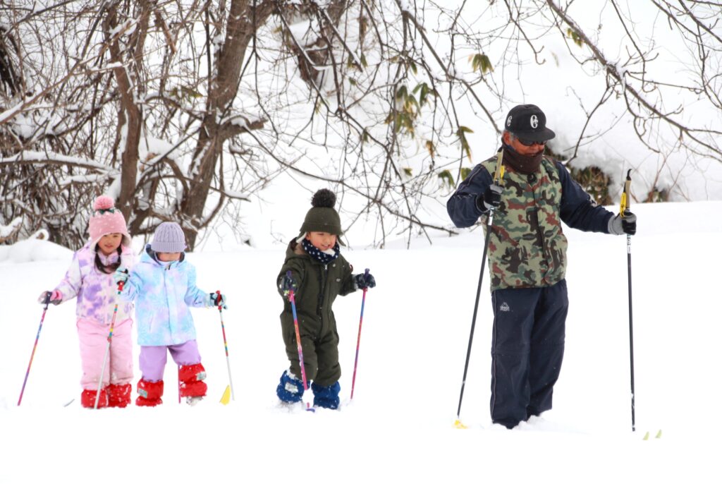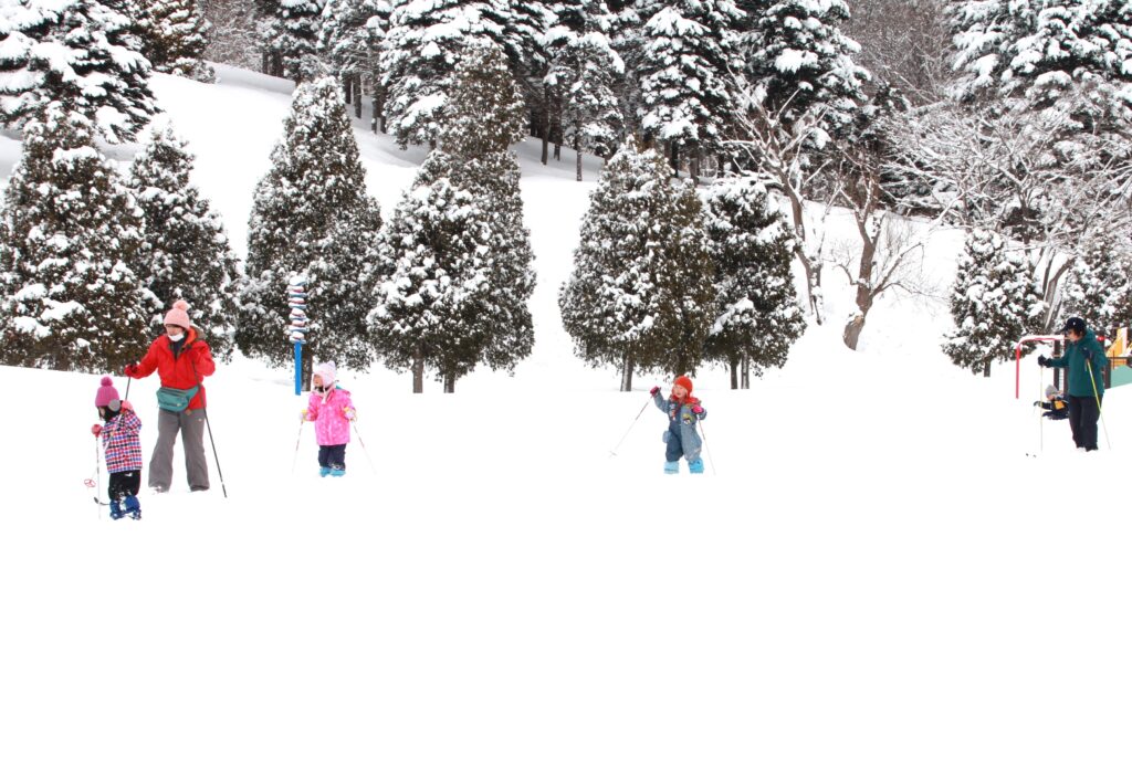 2月13日(金)、「こんとあき(年中)」組でスキー遠足を行いました。3度の「あやめ公園」での練習を経て、最後はより広大な「いわみざわ公園」で冬ならではの自然の素晴らしさを楽しみました。当日は悪天候の予報でしたが、子どもたちの願いが届いたのか、予定時間を100%歩き切ることができました。年中になって初めての経験ということもあり、最初不安を感じていた子どもたちも元気に笑顔でスキーに向き合い、たとえ転んでもまずは自分の力で起き上がろうとする姿はとても逞しかったです。子どもたちの確かな成長を感じる一日となりました。お忙しい中、貴重な学びの機会を支えていただいた「岩見沢歩くスキーの会」の皆様、大変お世話になりました。