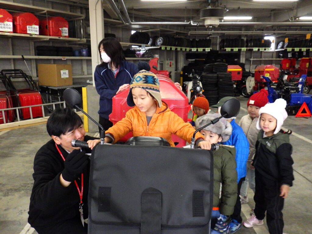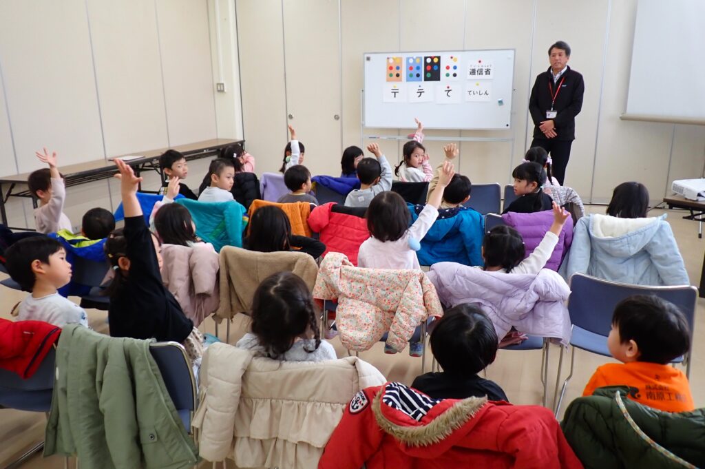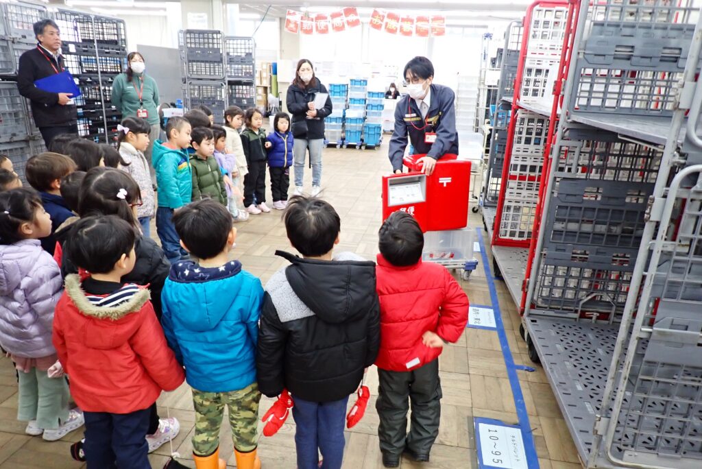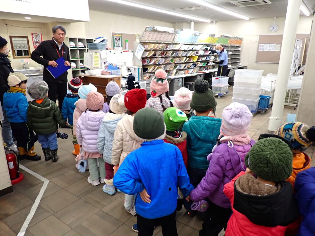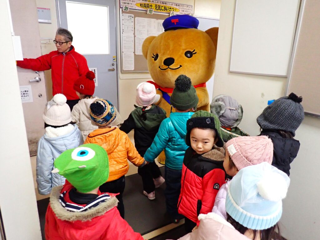 満2・3、年少クラスの消防署訪問に引き続き、11月14日(金)は、「こんとあき(年中)」組が岩見沢郵便局へ職場訪問に出かけてきました。到着するとすぐに「ぽすくま」くんのお出迎えを受け、いやがうえにも期待の高まる年中さんたちです。はじめに郵便物を仕分けするお部屋を見学し、集配の流れを教えていただきました。次に車庫へと移動し、バイクと郵便車に順番に乗せていただきました。また、簡易ポストを使って構造を知ったり、投函する体験をしたりしました。最後はDVDを鑑賞して郵便局のお仕事をおさらいしたあと、子どもたちからの事前の質問にていねいに答えてくださいました。「ポストはなぜ赤い?」「郵便局のマーク(〒)はどこからきたの?」などの質問には図を使ってわかりやすく説明していただきました。岩見沢郵便局様におかれましては、この度の訪問に多くの職員の皆様が親身に関わってくださり、子供たちにとって大変楽しい時間となりました。お忙しい中本当にありがとうございました。