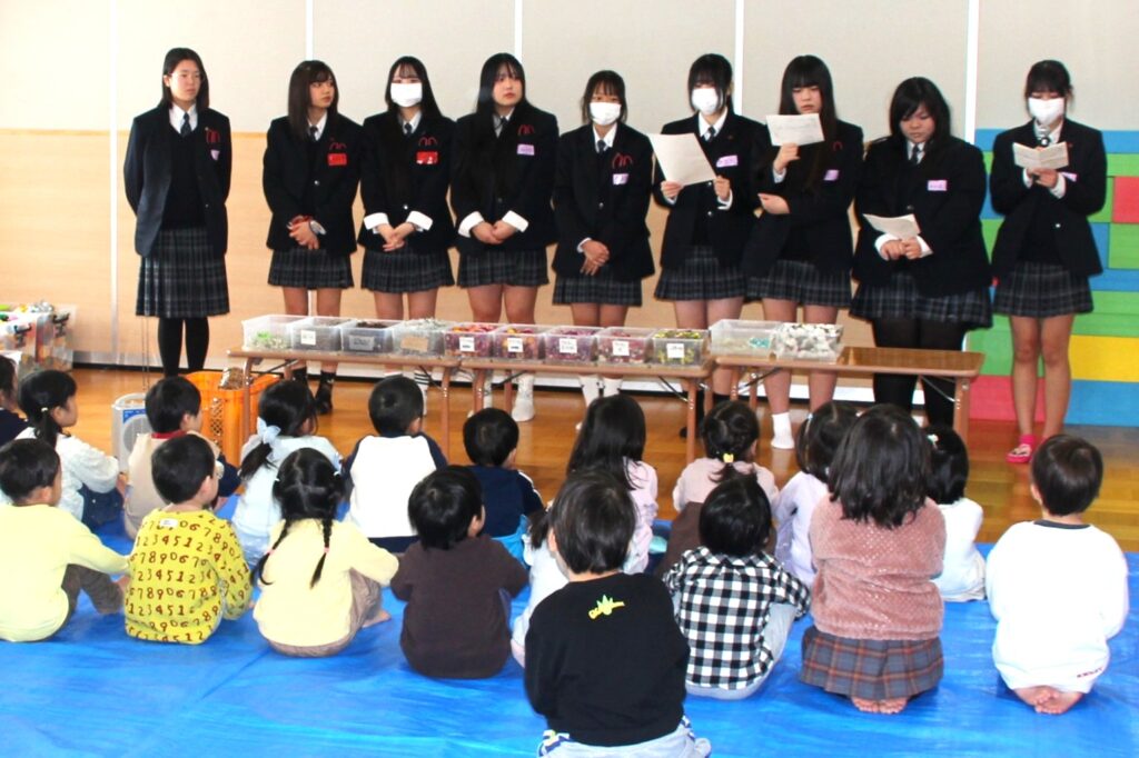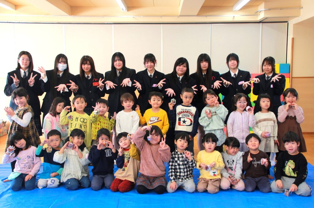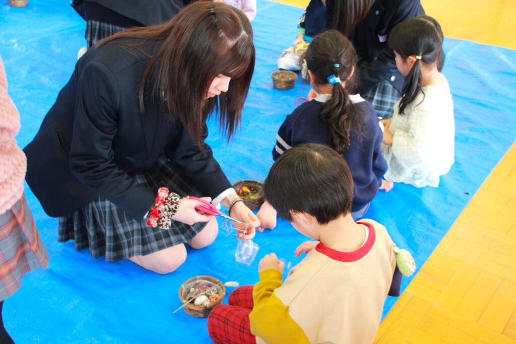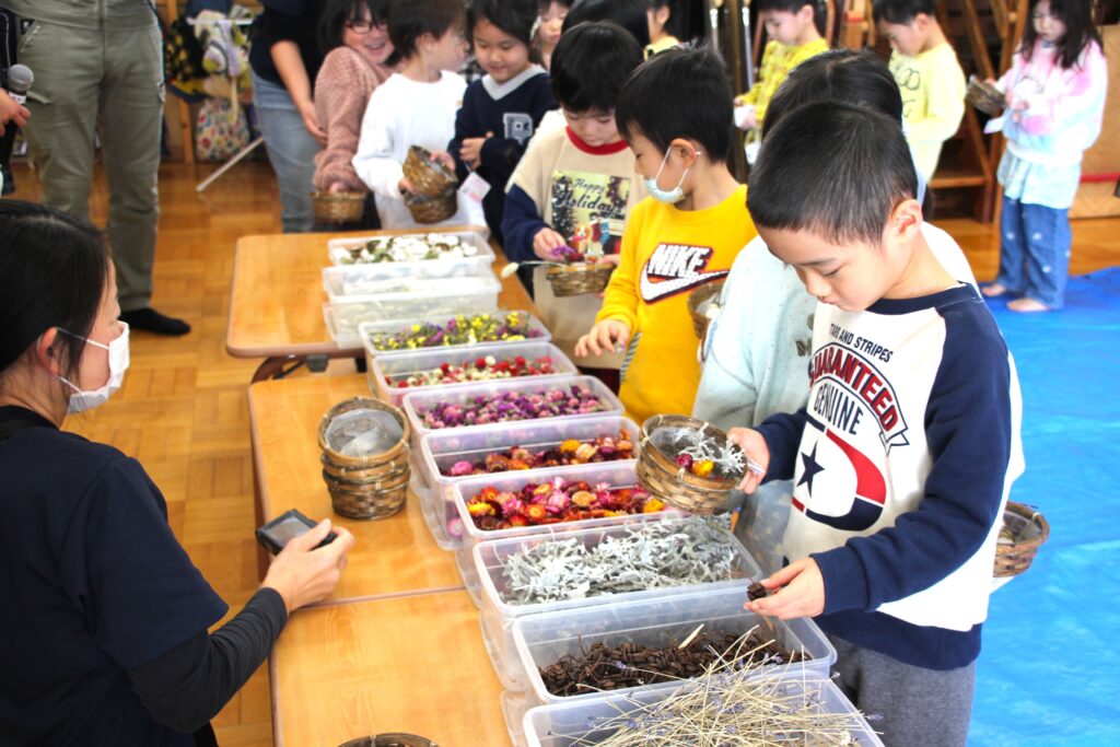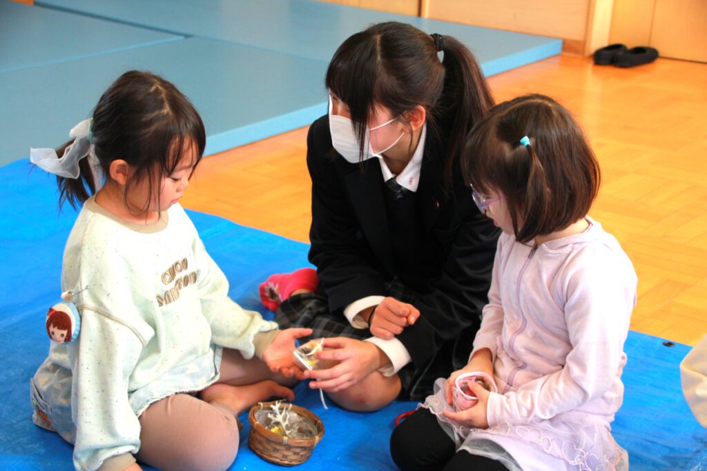 12月9日(火)、「こんとあき(年中)」組では、岩見沢農業高校2年生のご指導による「花育」を実施しました。生徒さんたちが用意してくれたドライフラワーから、お気に入りを選んで詰めていく「ドライのミニポーチ」づくりに挑戦です。子どもたちはあまり迷うことなく材料を選び、生徒さんたちのアドバイスを得ながらてきぱきと制作を進めていきました。また、困ったときにはしっかりと質問して、お手伝いをしてもらうこともできました。高校生とのふれ合いに子どもたちは大変満足した様子で、「たのしかった」「うれしかった」という声が多く聞かれました。最後は、こんとあきのお部屋に生徒さんたちが来て、子どもたちと楽しく遊んでくれました。
