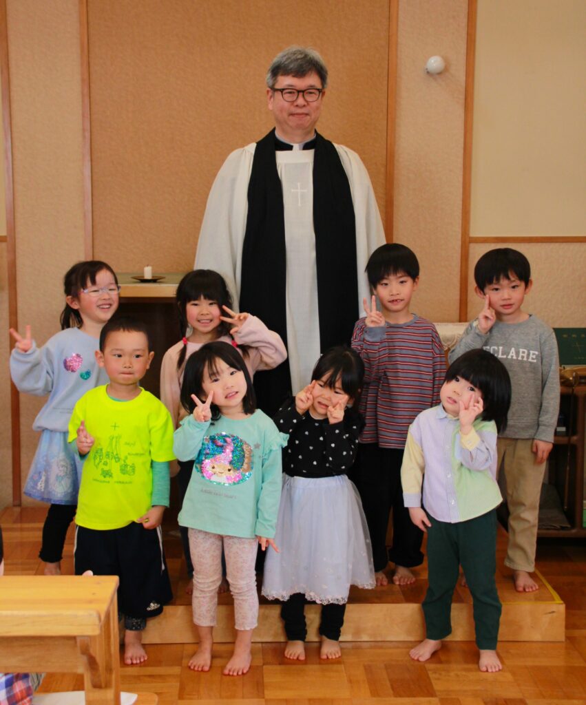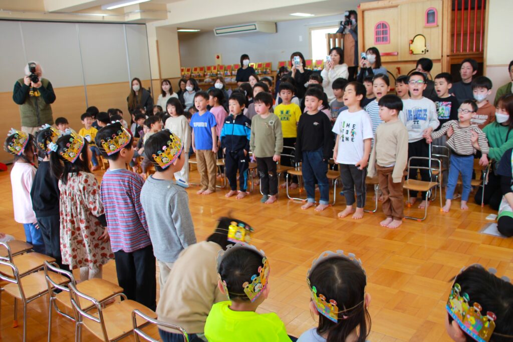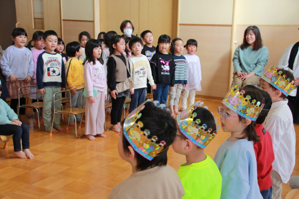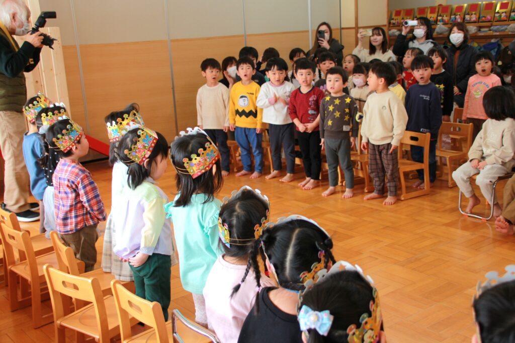 2月17日(火)、2月生まれと3月生まれの子どもたち19人のお誕生会を行いました。いつものように一人ずつ自己紹介を行い、クラスごとにおめでとうの気持ちを込めて歌のプレゼントを贈りました。そして、今回の先生方の出し物は「声当てゲーム」。暗幕に隠れている先生の声を聞いて誰かを当てるという内容でしたが、声色を変えたことで意外に難しく大盛り上がりのゲームとなりました。その後は礼拝堂に移動し、永谷チャプレンより祝福を受けました。