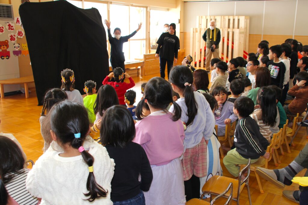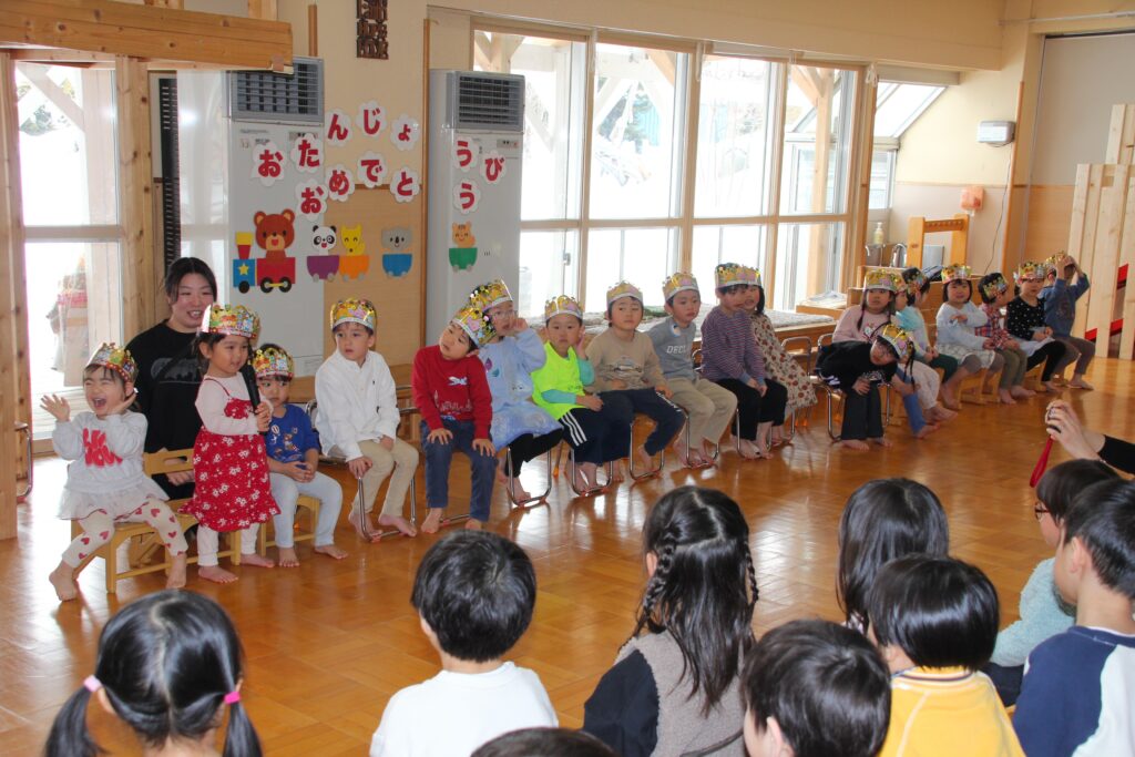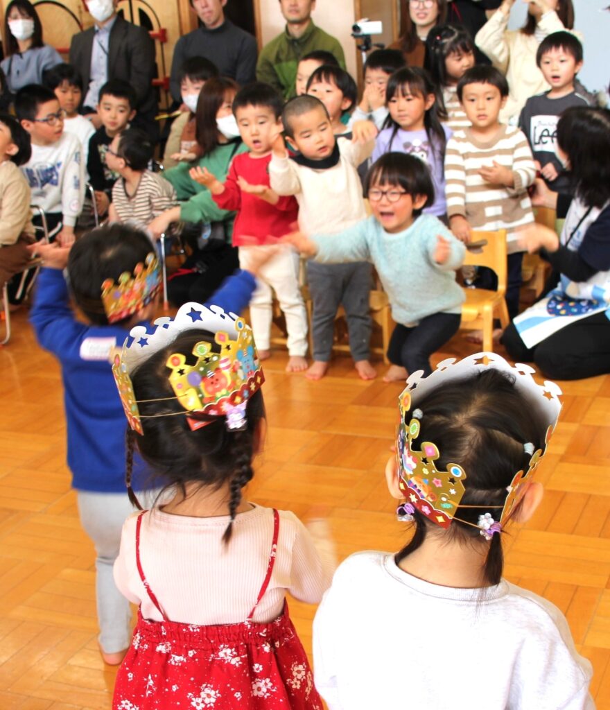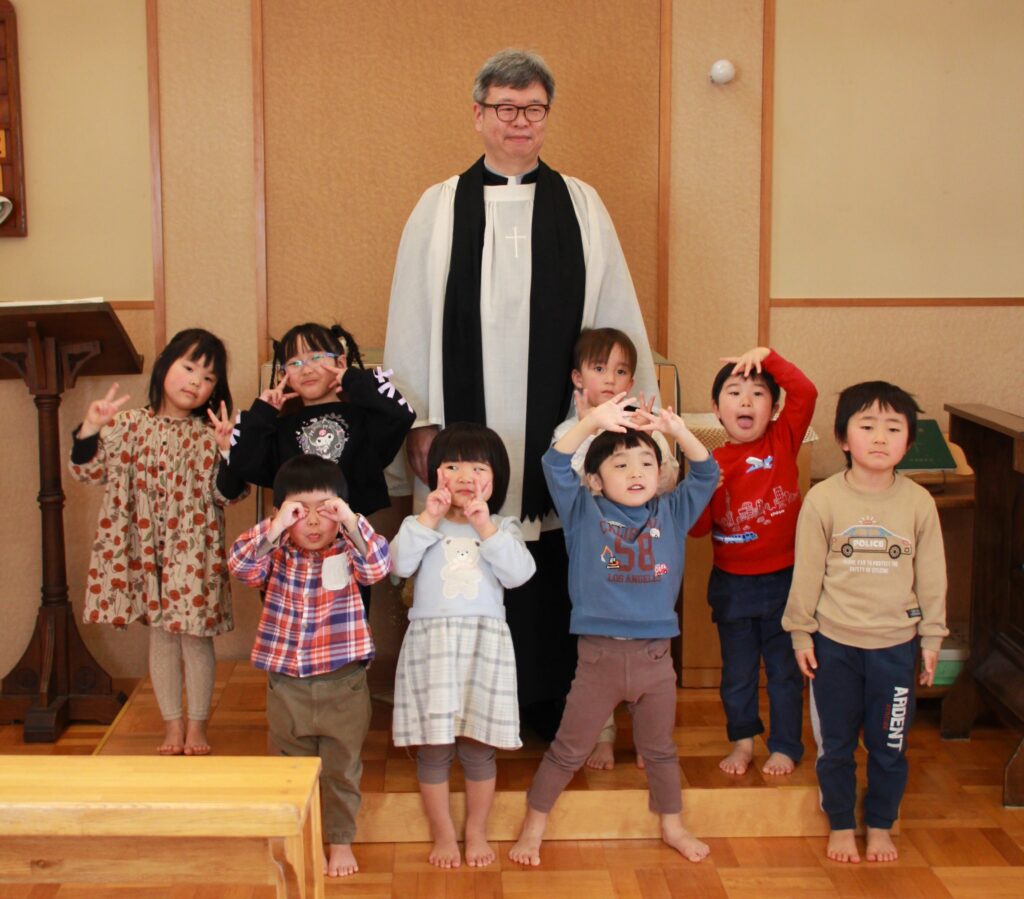 2月17日(火)、2月生まれと3月生まれの子どもたち19人のお誕生会を行いました。いつものように一人ずつ自己紹介を行い、クラスごとにおめでとうの気持ちを込めて歌のプレゼントを贈りました。そして、今回の先生方の出し物は「声当てゲーム」。暗幕に隠れている先生の声を聞いて誰かを当てるという内容でしたが、声色を変えたことで意外に難しく大盛り上がりのゲームとなりました。その後は礼拝堂に移動し、永谷チャプレンより祝福を受けました。