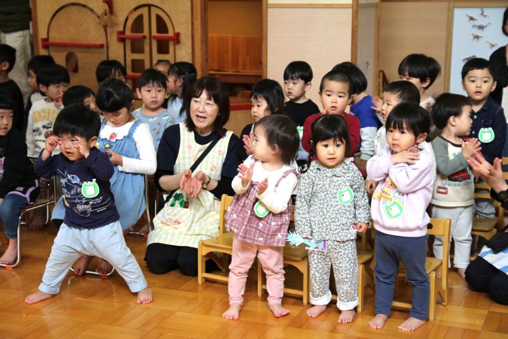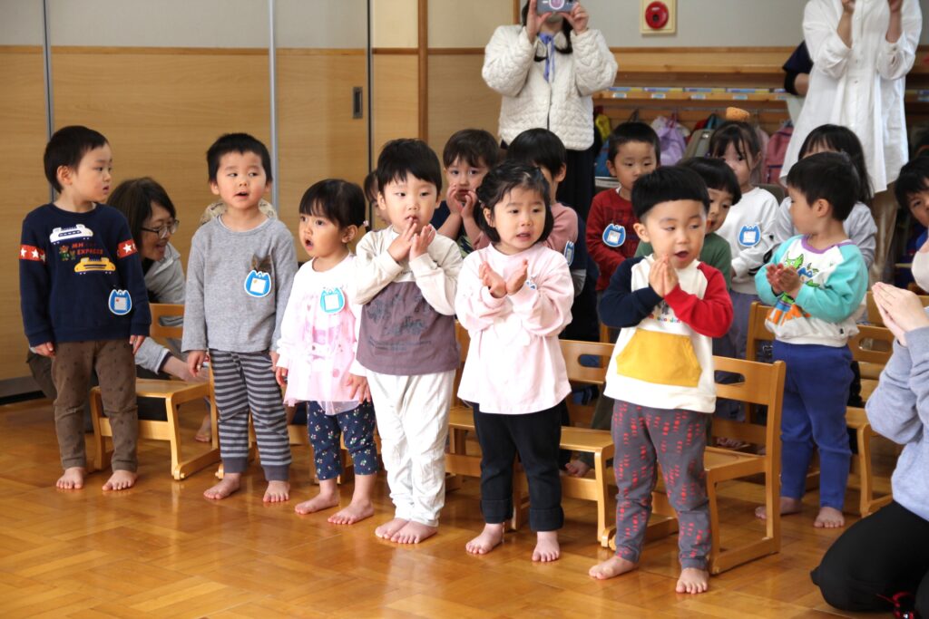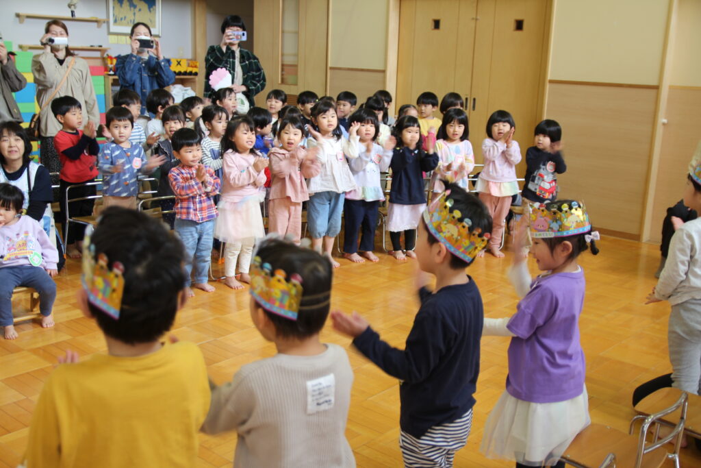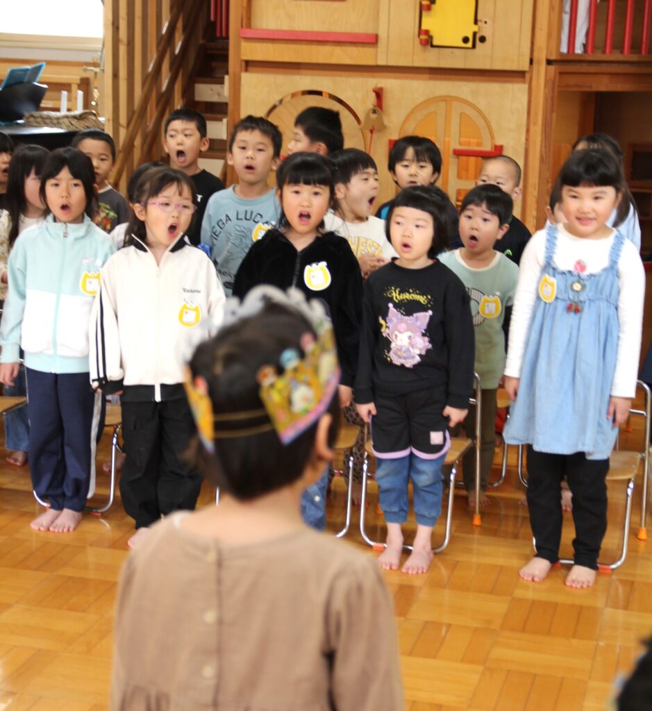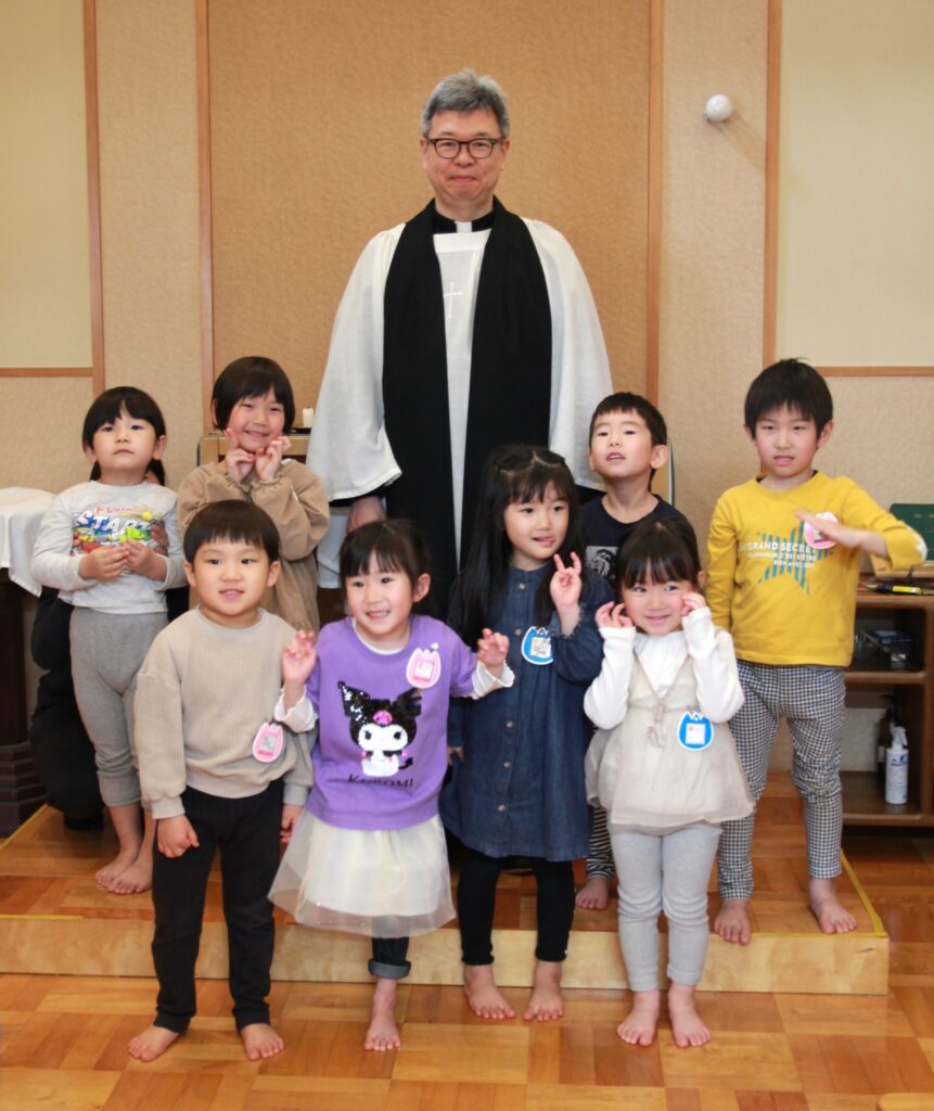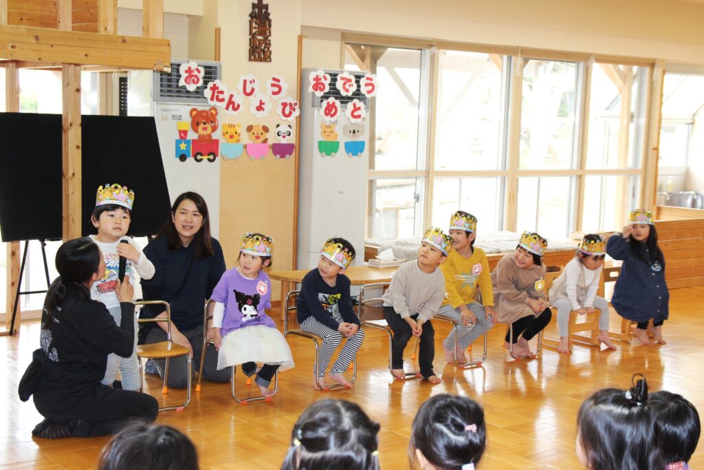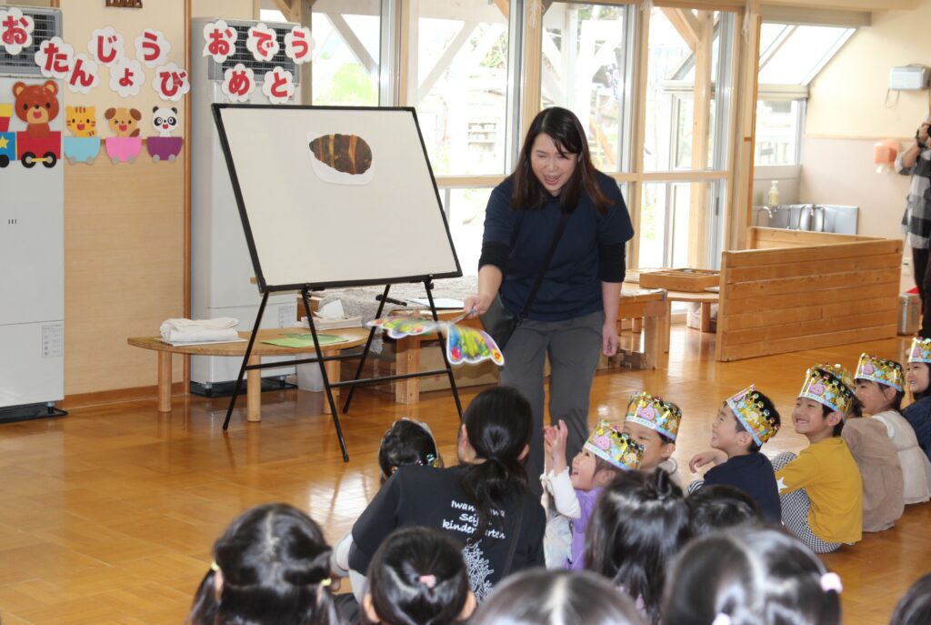 4月28日(火)、4月生まれの子どもたち8名のお誕生会を行いました。自己紹介の後には各クラスより歌のプレゼントがあり、ホールには元気な声が響き渡りました。そして、今回の出し物はパネルシアターによる「はらぺこあおむし」でした。先生の声に合わせて一緒に歌う子どもたちがかわいらしかったです。最後に、保護者の皆様とともに礼拝堂に移動して一人一人が永谷チャプレンより祝福をいただきました。